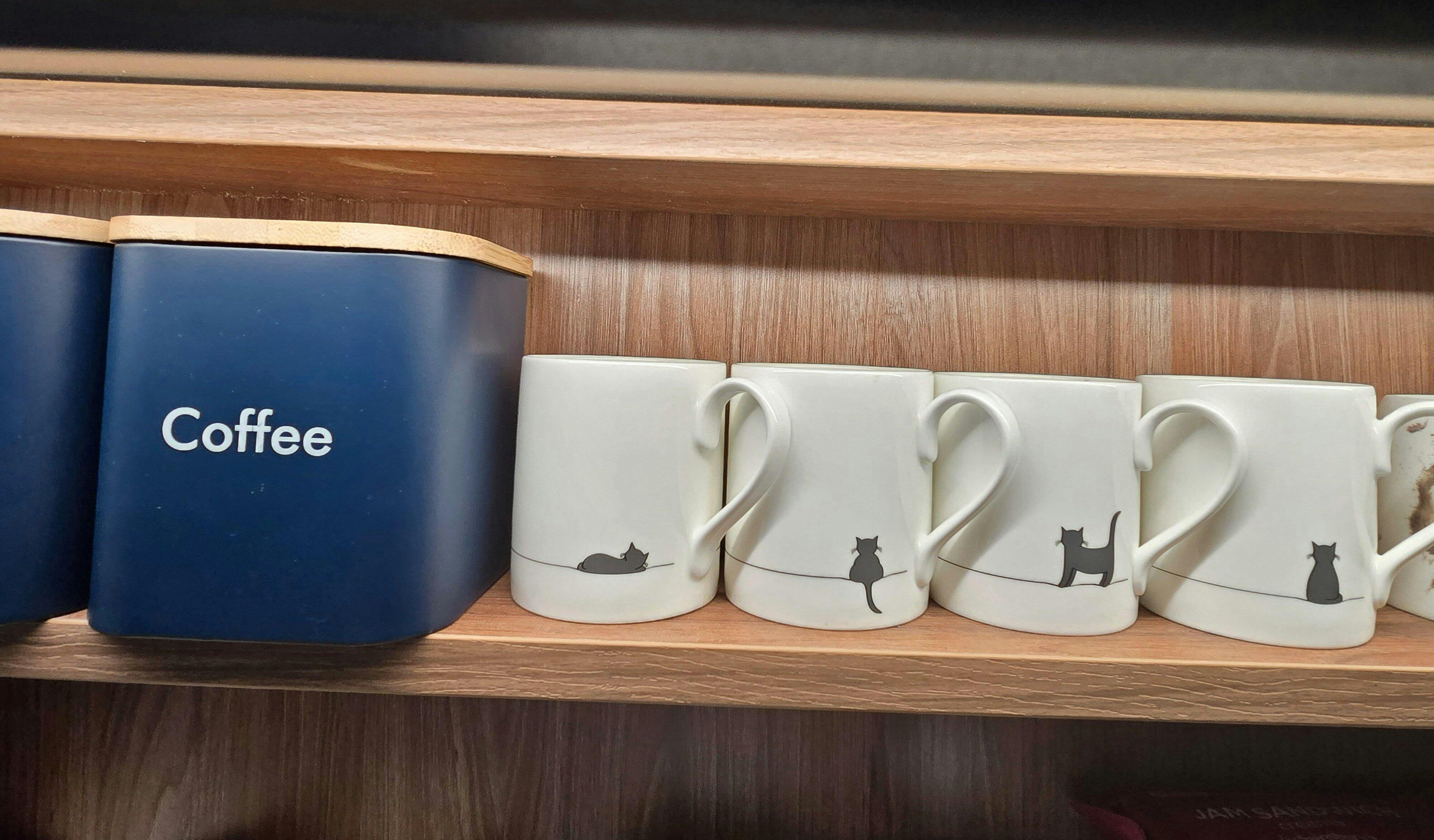 A set of 4 beautiful cat mugs, each one with a unique cat design by Jin Designs. There's Sitting Cat, Sleeping Cat, Standing Cat and Crouching Cat. The fine bone china mugs are perfect for cat lovers who are looking for more sophisticated designs. They make a wonderful gift for that crazy cat person you know - or indeed anyone who loves cats. Popular with design conscious crazy cat people across the world. These are delicate size mugs (275ml), slightly smaller than standard, which fit neatly under most coffee machines and are great for afternoon cups of tea. Also good for an evening hot drink before bed when you don't want too much in your cup.