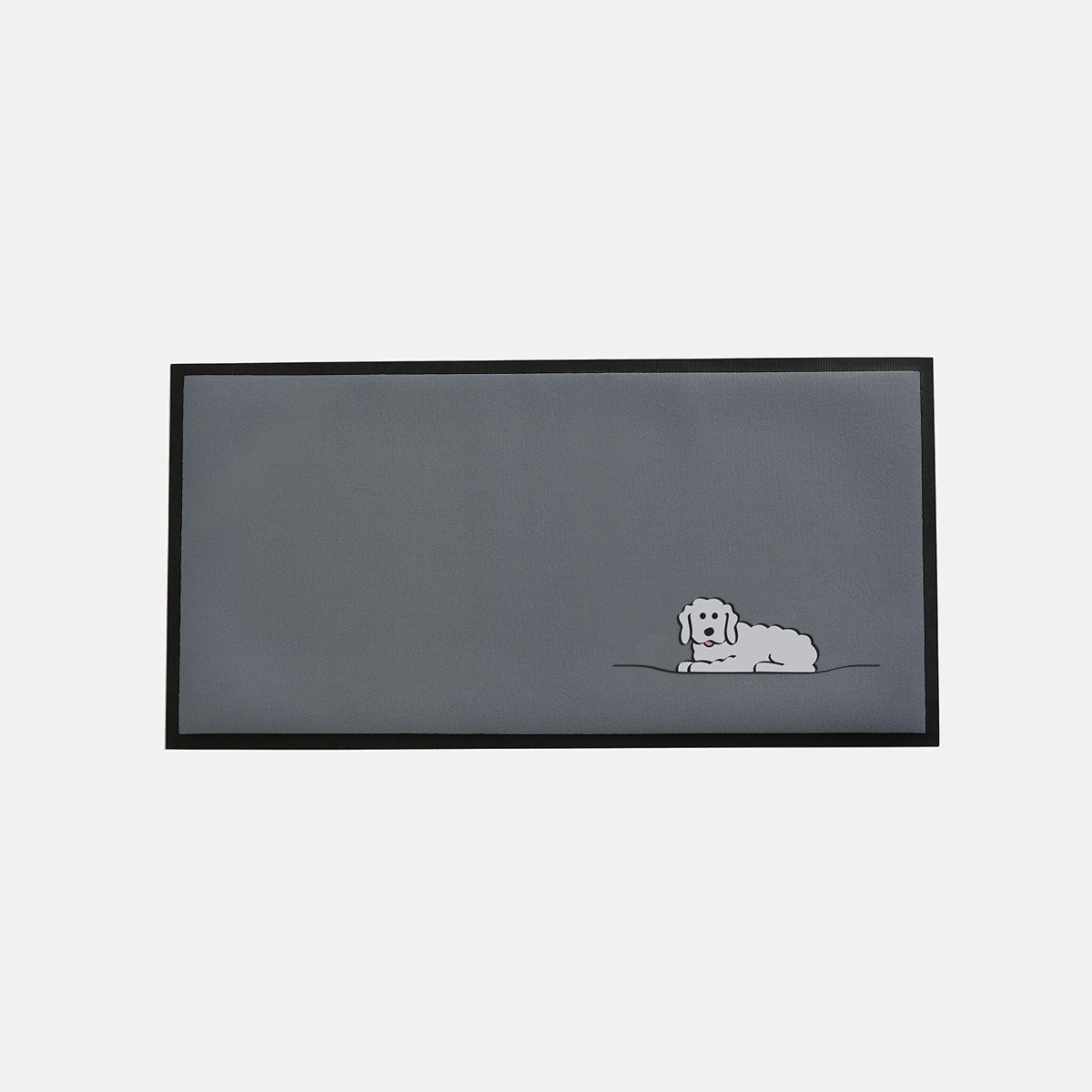 The mat is a slate blue-grey colour with a black rubber backing and border. Fluffy Dog is a neutral light grey with a black outline.