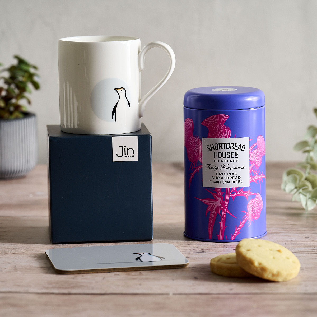 Set includes: Penguin Mug (Standard 275ml) in a Jin Designs Gift Box, Coaster, and 140g Tin of Shortbread