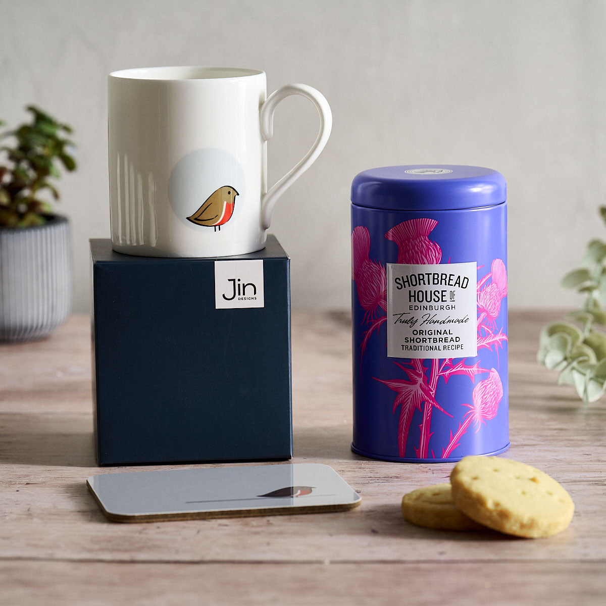 Set includes: Robin Mug (Standard 275ml) in a Jin Designs Gift Box, Coaster, and 140g Tin of Shortbread