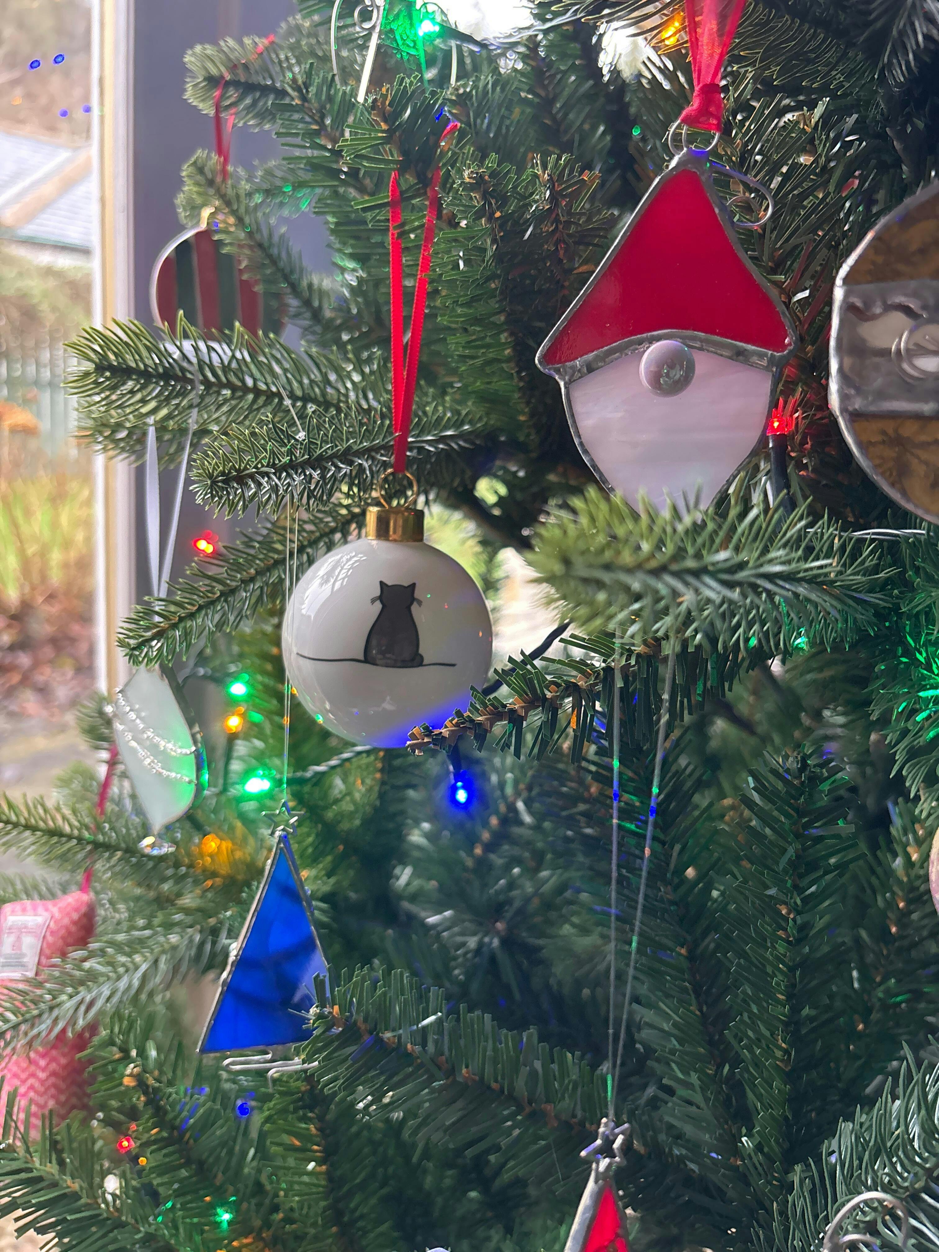 Adorable fine bone china bauble, hand-decorated with Sitting Cat, a Jin Designs bestseller. Hang this fine bone china bauble on your Christmas tree or other festive decorations and enjoy it year after year. Tied with a red ribbon, this beautiful cat lover bauble brings style and charm to festivities. The bauble is white and the decoration appears once. It's a unique and special addition to Christmas decorations. Also makes a lovely gift for family and friends or give it to yourself this Christmas. Bring out the baubles year after year!