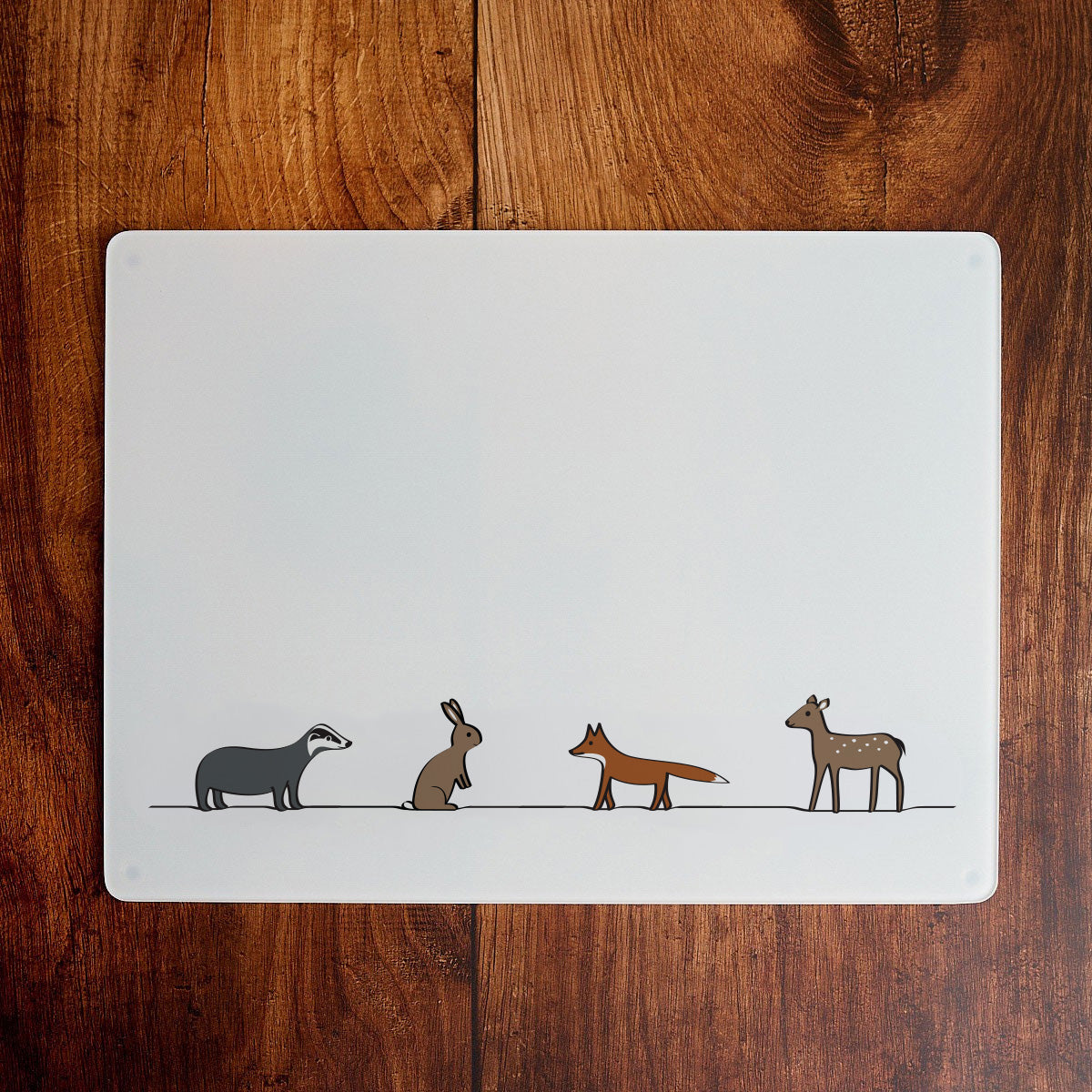 An adorable addition for your kitchen - features all your favourites from the Jin Designs Woodland Collection. You'll find Badger, Fox, Deer and Rabbit in a rare appearance together on one handy worktop saver to brighten up your kitchen and home. Use this British made recycled glass worktop saver to protect work surfaces or in the dining room to protect the dining table. An ideal gift for any animal lover.